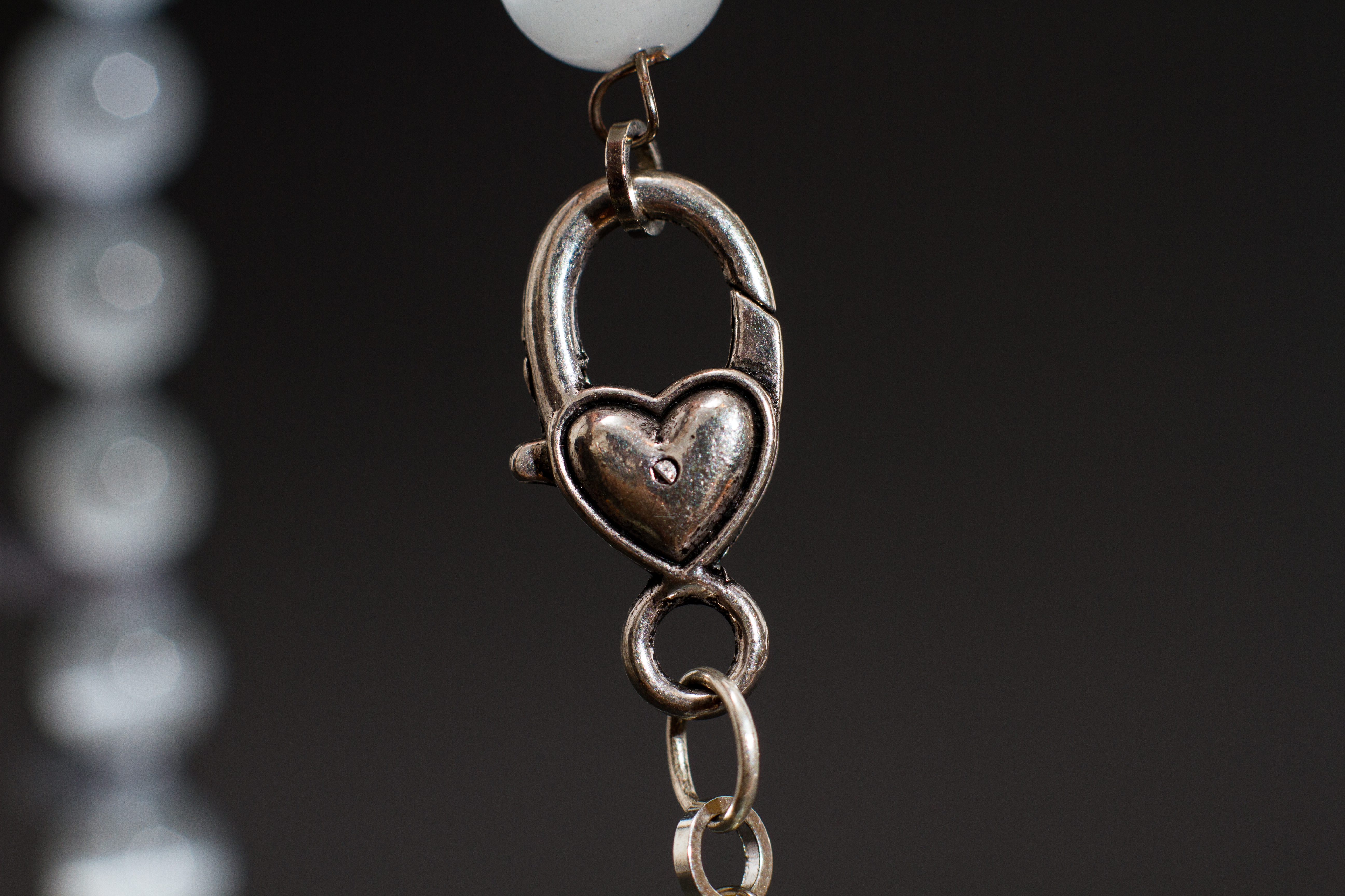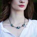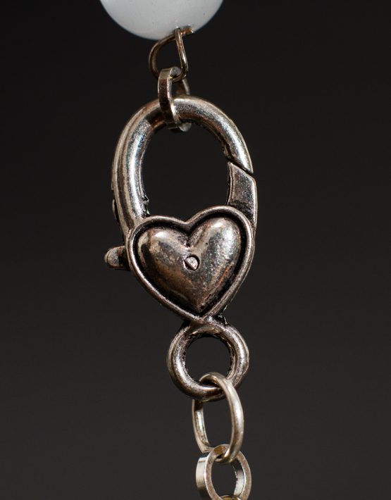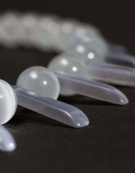 Colier din mărgele ochi de pisică, alb spre gri foarte, foarte deschis, cu reflexii deosebite, în funcție de lumină.