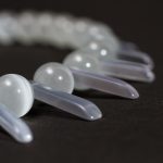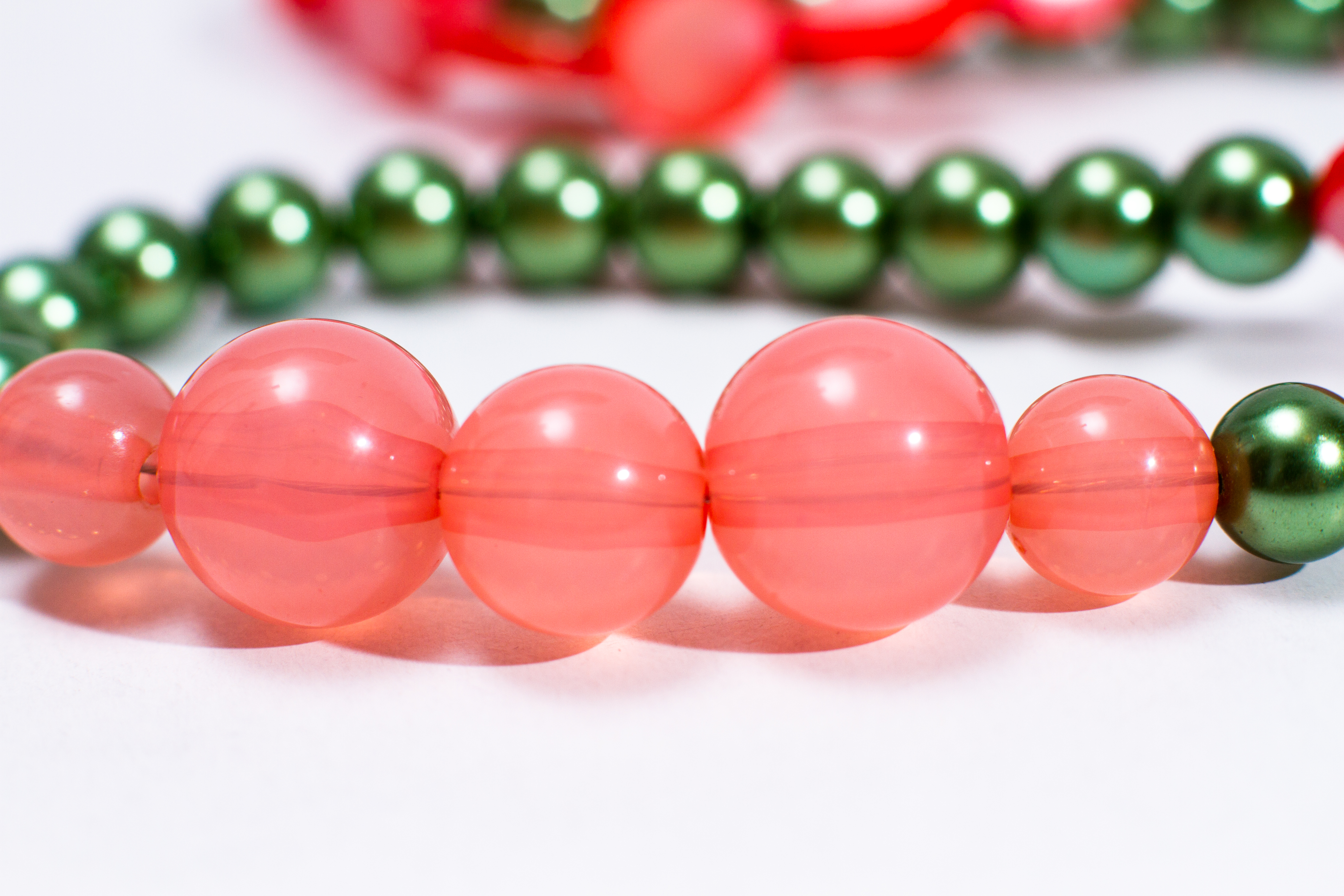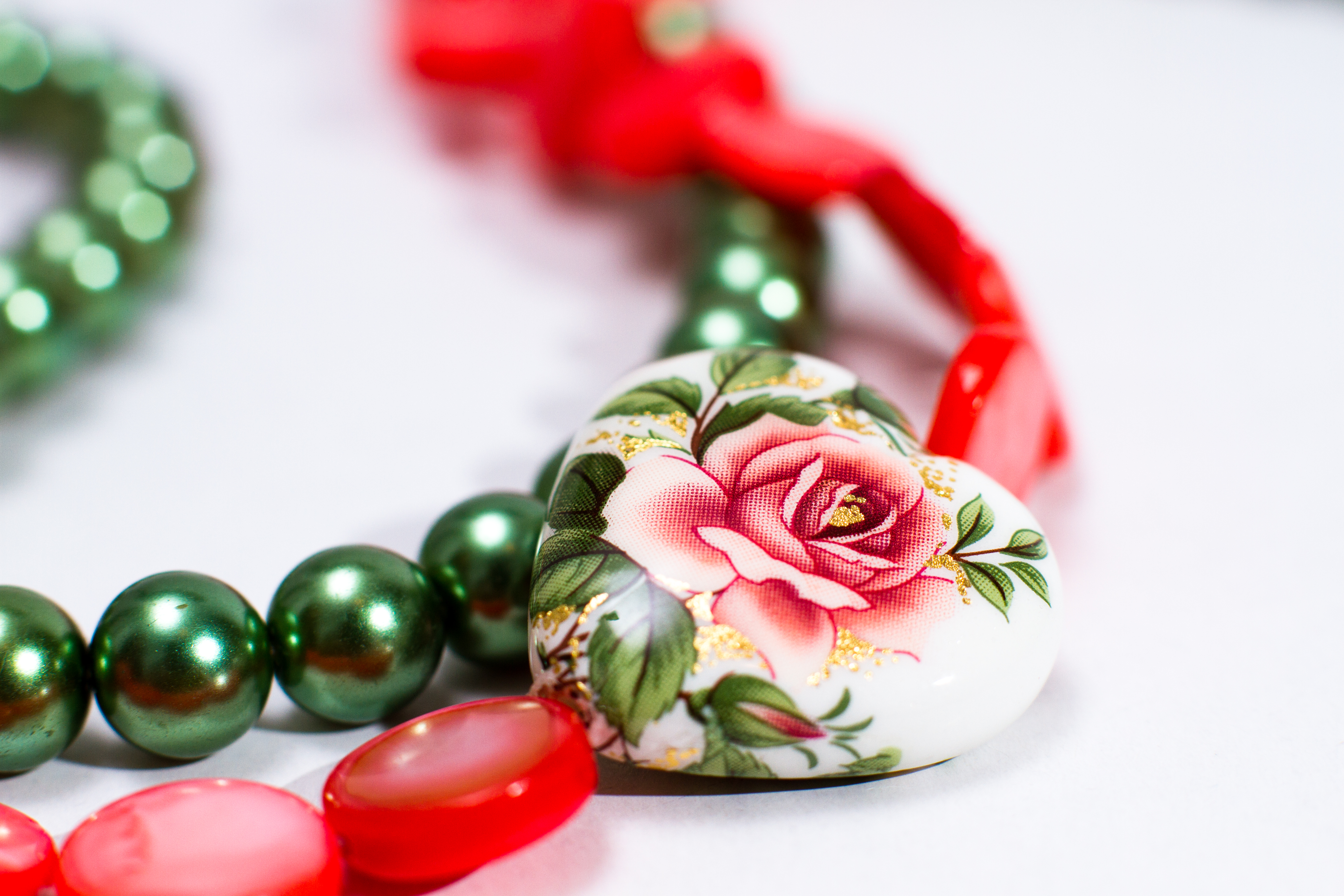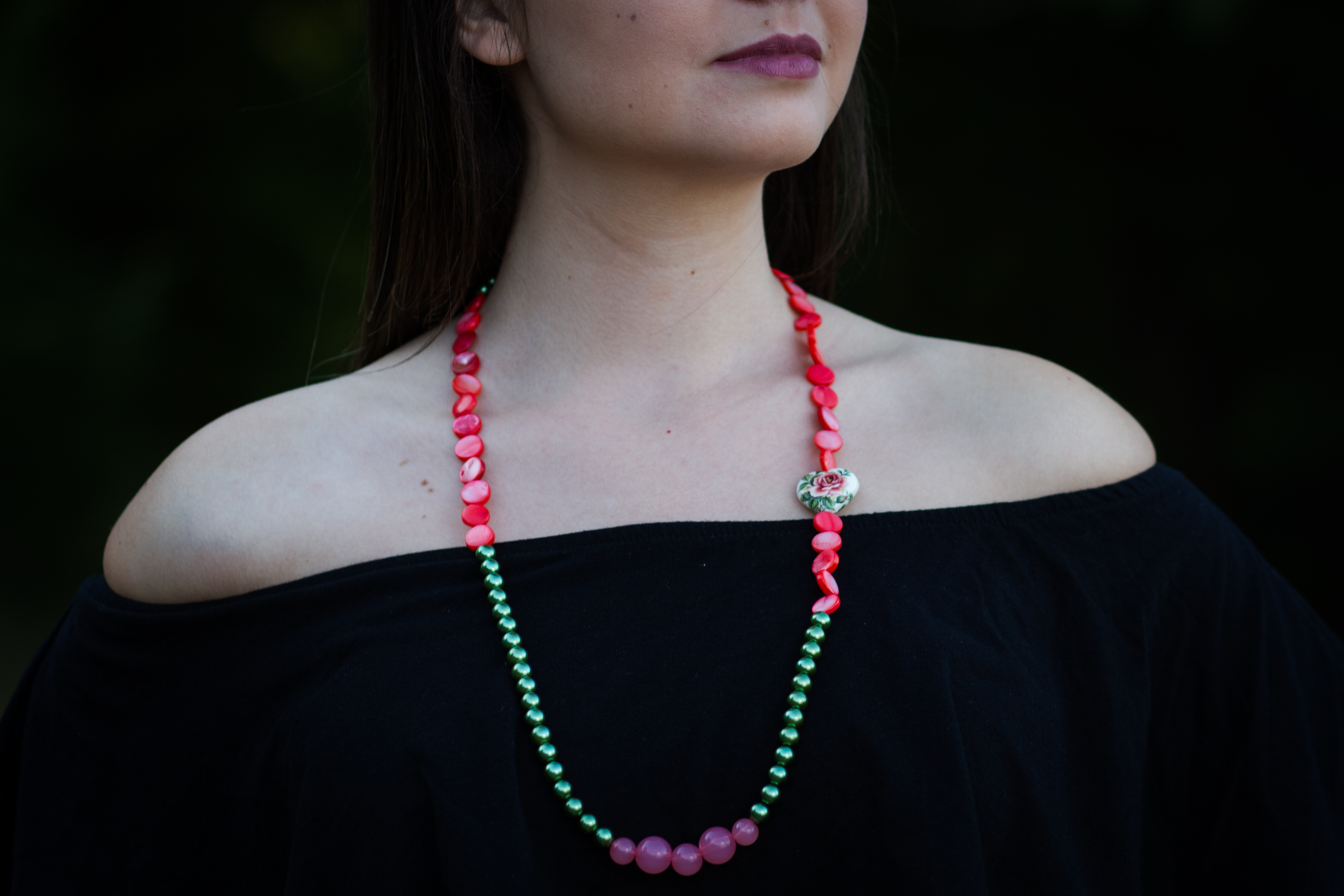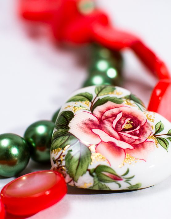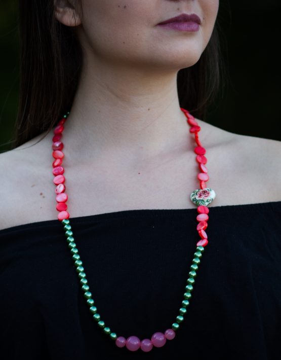Colierul lung, Fresh Tensha, din perle de sticlă verzi în combinație cu mărgele din rășină transparente și bănuți de sidef frez , armonizat de inimioara Tensha pictată manual, este conceput drept o paralelă între stilul Art Nouveau și Vintage