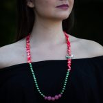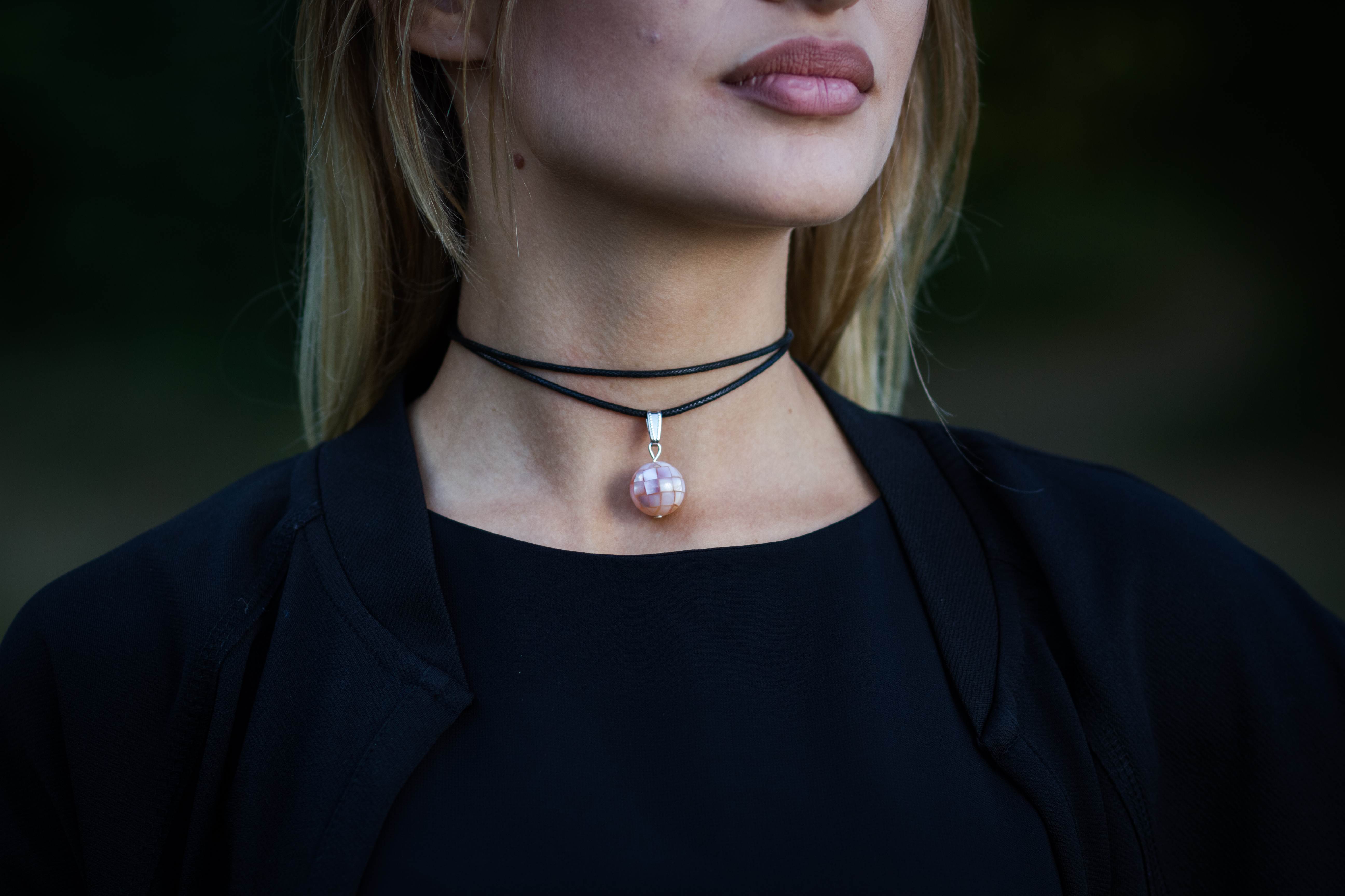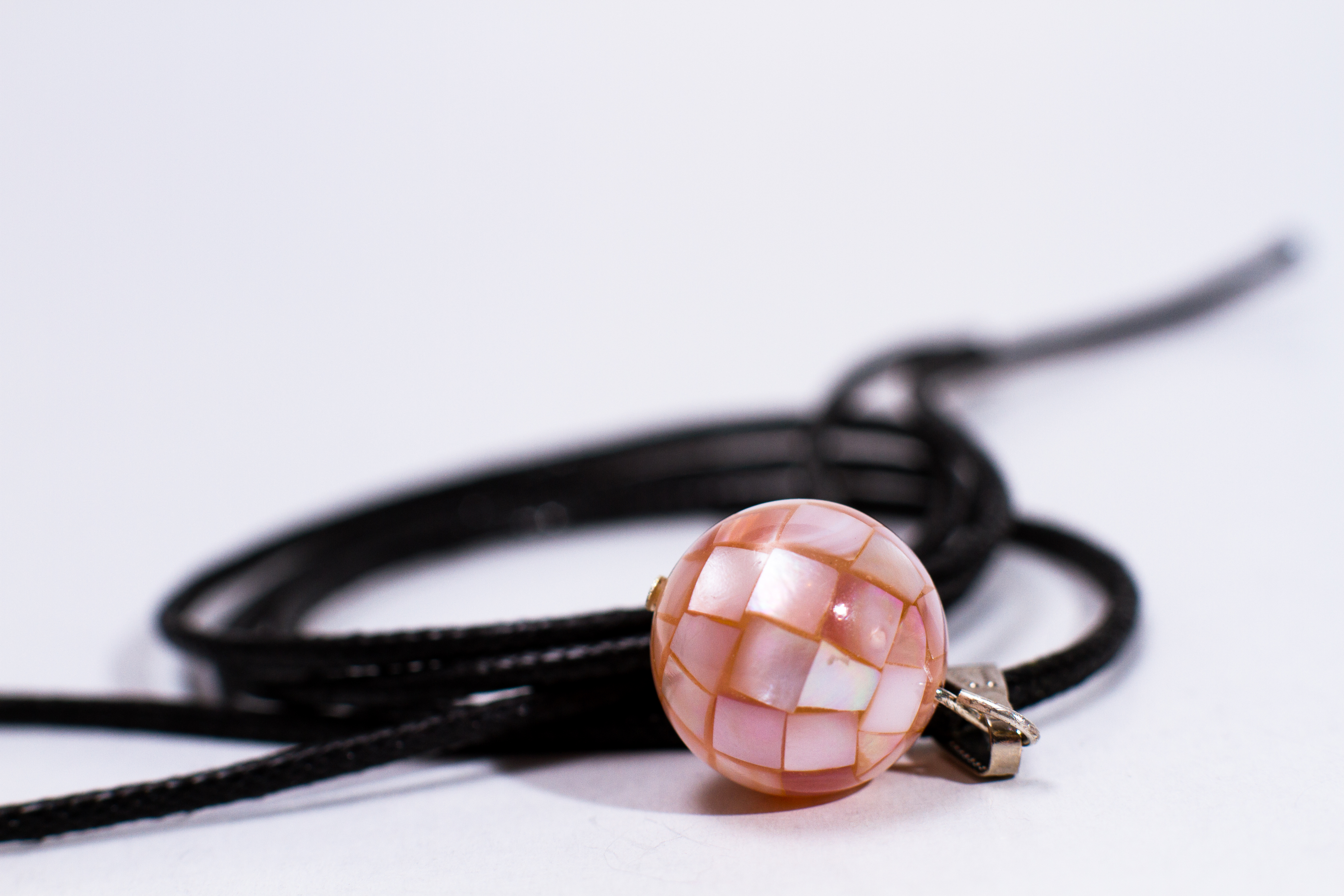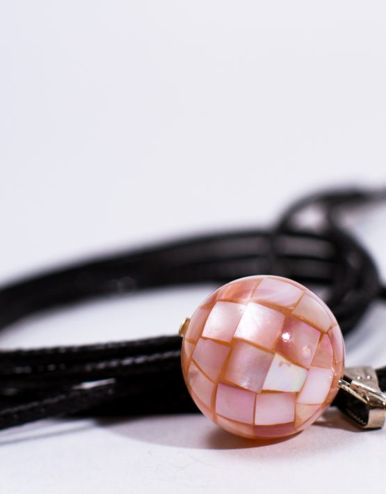 Medalion roz piersică Paua Shell pe șnur negru . Rozul sensibil a fragrmentelor de scoici Paua și textura snurului scot în evidență personalitatea delicată și pasională a purtătoarei.